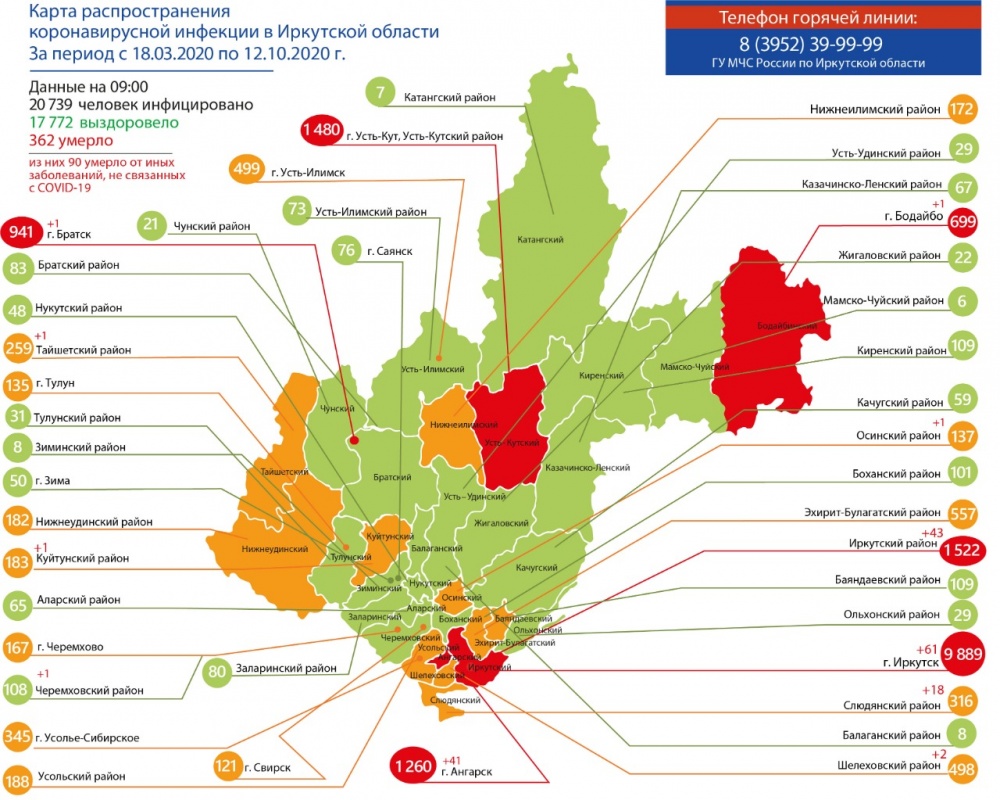 В настоящее время в больницах Приангарья находятся 2 014 (+77) пациентов с коронавирусом. За все время распространения инфекции выздоровело 17 772 (+8). Умерло 272 (+2) от самого COVID и 90 человек от иных, не связанных с COVID-19. В правительстве представили карту распространения инфекции на сегодняшний день.