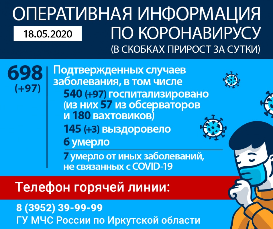 За последние сутки в Иркутской области выявили 97 новых случаев заражения коронавирусной инфекцией. Всего на 18 мая в регионе 698 подтвержденных случаев COVID, сообщили в оперативном штабе.